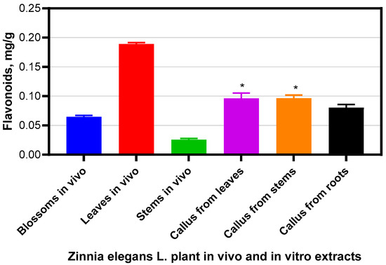 Flavonoid concentration (according to quercetin) in Zinnia elegans L. plant extracts. The error bars show the mean ± SD from three replicates. Asterisks show statistically significant comparisons between Zinnia elegans L. plant in vivo extracts (from leaves and stems) and callus cultures (from leaves and stems) in vitro were tested with an unpaired two-tailed t-test, with a significance level set at * p < 0.01.