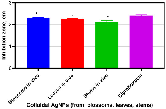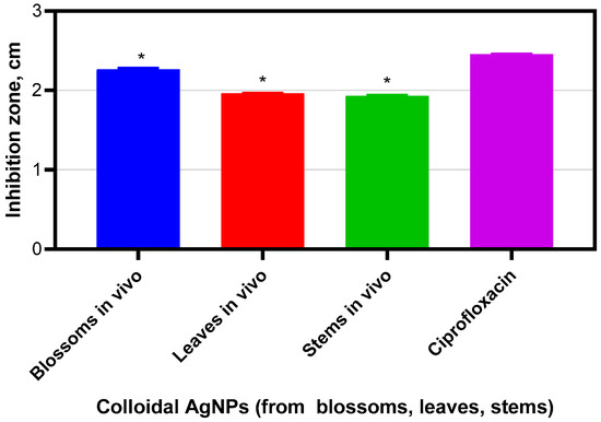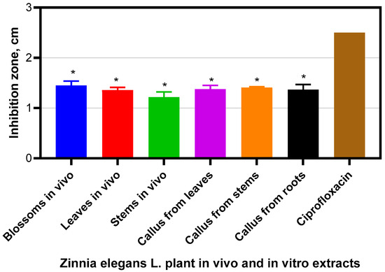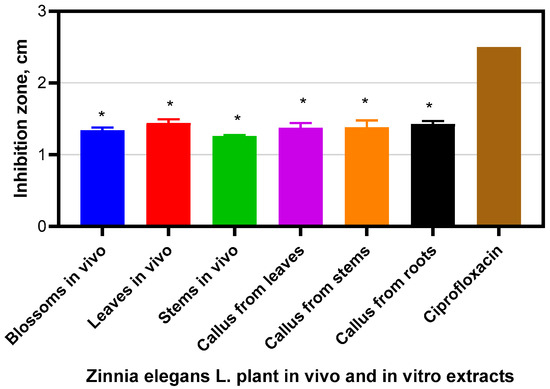Antibacterial activity of Zinnia elegans L. against B. subtilis. The error bars show the mean ± SD from three replicates. Asterisks show statistically significant comparisons between the ciprofloxacin and plant in vivo and in vitro extract experiments, which were tested with an unpaired two-tailed t-test, with a significance level set at * p < 0.01.