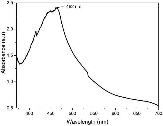 Ultraviolet–visible spectrophotometry is a widely used approach for analyzing nanoparticles by measuring their light absorption. This method is particularly useful for identifying metal nanoparticles through their surface plasmon resonance bands, which depend on the particle size, shape, and composition. Localized surface plasmon resonances (LSPR) arise from the coherent oscillation of conduction band electrons induced by incident light at the nanoparticle surface. For AgNPs, this phenomenon typically produces an absorption maximum within the 400–450 nm range. The peak position is highly sensitive to particle size, shape, surface state, and interparticle interactions [47]. The recorded absorption spectrum showed a distinct localized surface plasmon resonance peak centered at 462 nm, accompanied by significant spectral broadening (Figure 9).