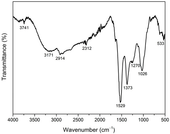 A broad band at approximately 3741 cm−1 corresponds to N–H amide [48] stretching, while a band at 3171 cm−1 corresponds to O–H stretching vibrations that are typically associated with the hydroxyl groups in phenols, alcohols, or flavonoids [49,50]. The band at 2914 cm−1 has been assigned to C–H stretching vibrations of aliphatic –CH2 groups, suggesting the presence of long-chain hydrocarbons or terpenoids. The absorption band at 2312 cm−1 can be attributed to stretching vibrations of C≡C or possibly interactions of CO2 absorbed from the atmosphere. The intensive band at 1529 cm−1 may correspond to the asymmetric N–O stretching (possibly in nitro compounds) or aromatic C=C stretching in polyphenolic compounds. The peak at 1373 cm−1 is characteristic of C–N stretching vibrations, indicating the presence of amine groups. The bands at 1270 cm−1 and 1026 cm−1 are commonly associated with C–O stretching vibrations, probably from alcohols, esters, or ethers. Notably, an absorption peak at 533 cm−1 corresponds to Ag–Ag bond vibrations, confirming interaction between the silver core and biomolecules in the extract. This indicates successful capping and stabilization of AgNPs by plant-derived compounds [50,51]. The broad stretching vibrations corresponding to the H–C=O, i.e., C–H functional groups of aldehydes and the –OH groups of alcohols and phenols, indicate that the biomolecules in the extract can act as reducing, capping, and stabilizing agents in the synthesis of AgNPs [8,40,50]. The Zinnia elegans L. plant extract contains various polyphenolic compounds that can chelate silver ions and subsequently reduce them to zero-valent AgNPs.
