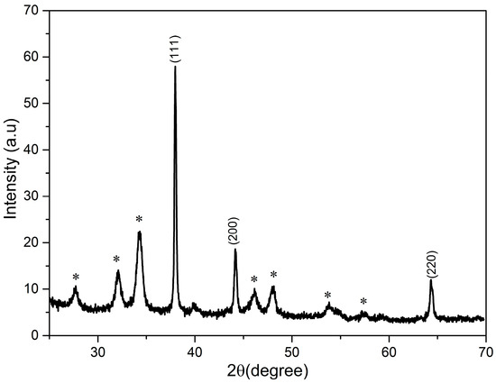 The crystalline structure and average crystallite size of the synthesized AgNPs were investigated using X-ray diffraction. The diffraction pattern revealed characteristic peaks at 2θ values of 38.13°, 44.33°, and 64.51°, as seen in Figure 11. These peaks correspond to the (111), (200), and (220) crystallographic planes of the face-centered cubic (FCC) silver structure, respectively. The presence of these peaks confirms the crystalline nature of the AgNPs and their FCC structure, which is consistent with the standard JCPDS card No. 04-0783 [38,50,52,53]. Additional peaks also appear in the diffractogram at 2θ = 27.74°, 32.09°, 34.34°, 46.17°, 48.11°, and 53.88°, 57.43° (marked with stars) and are weaker than the silver peaks. These spectral peaks are ascribed to the presence of crystallized organic compounds acting as capping and stabilizing agents on the surface of the AgNPs. Comparable findings have been documented for AgNPs synthesized via eco-friendly synthesis methods [49,50,54].