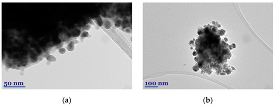 The average crystallite size of the Ag nanoparticles was determined using the Debye–Scherrer equation [36] and yielded a value of approximately 25 nm. The crystalline size of the AgNPs varies depending on the synthesis method and the biological reducing agents used. Reported sizes range from 5.5 nm [55] to approximately 60 nm [6,48]. Other studies report sizes within the 10–30 nm range [38,56].