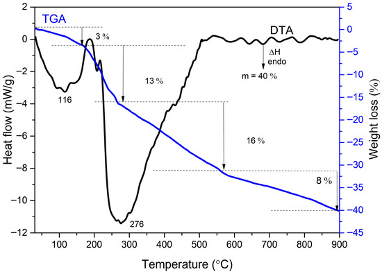 Thermogravimetric analysis: Thermogravimetric analysis (TGA) and differential thermal analysis (DTA) were performed to evaluate the thermal stability and composition of the biosynthesized AgNPs. The thermal stability and the loss of surface weight of the AgNPs were determined on a Linseis STA PT1600 thermal analyzer (Linseis Massgeraete GmbH, Selb, Germany). The TGA/DTA spectra were obtained under an N2 atmosphere at a heating rate of 10 °C·min−1 within the temperature range of 30 to 930 °C.
