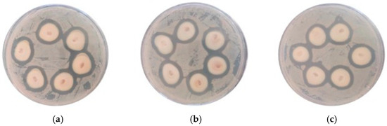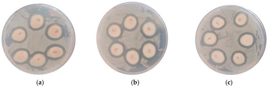 Inhibition zones formed by colloidal AgNPs synthesized using Zinnia elegans L. extracts against B. subtilis: (a) blossoms; (b) leaves; (c) stems.