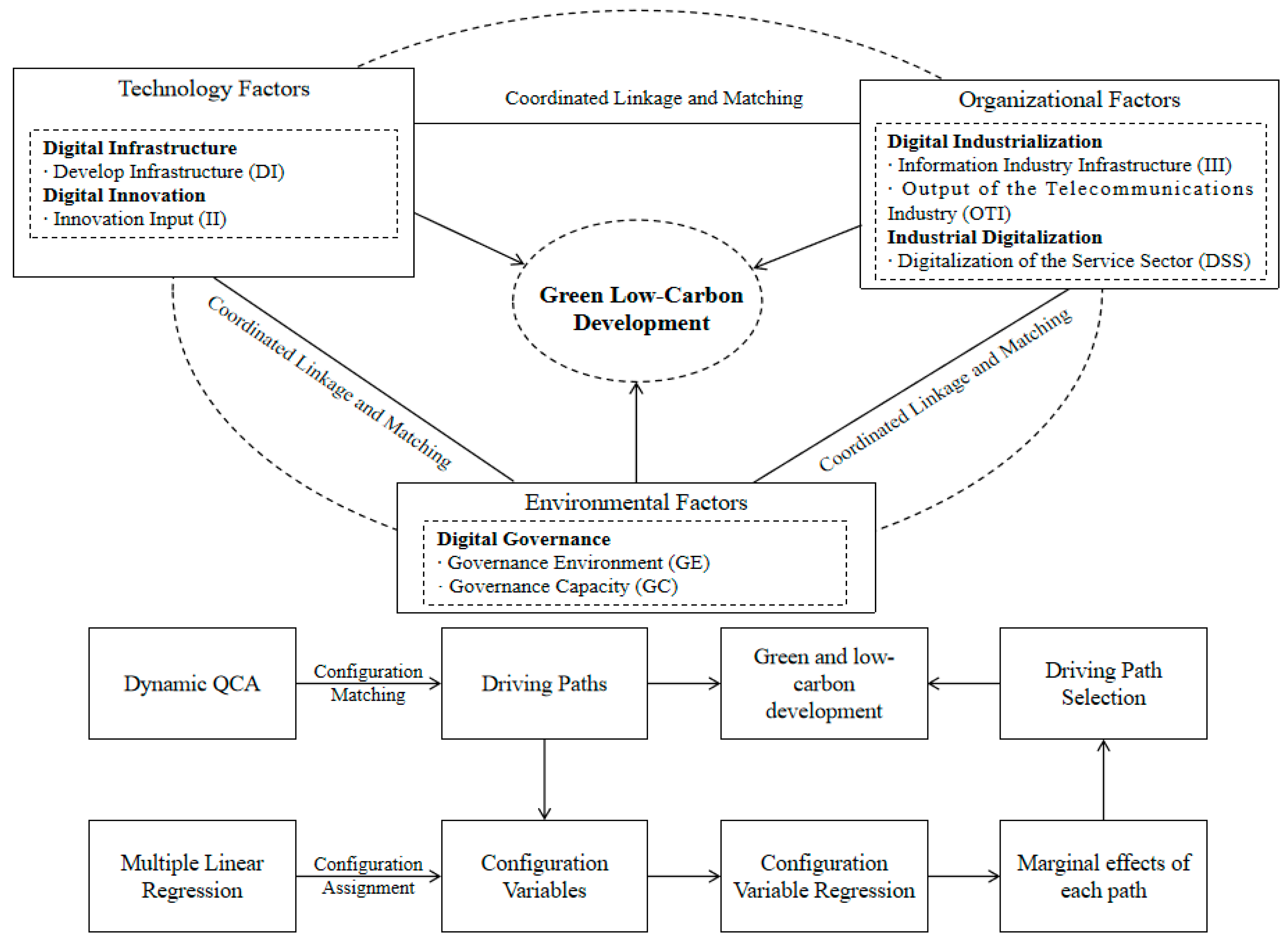 - Breaking free from the conventional single-factor linear analysis framework, this study integrates the TOE framework and dynamic QCA to unpack the asymmetric causal mechanism through which the DE drives GLD from the lens of multi-dimensional conditional configurations.