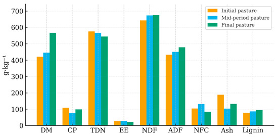 Animals were kept under a semi-feedlot system for 52 days, including a 12-day adaptation period and a 40-day data collection phase. Each morning at 9:00 a.m., the animals were moved to a collective paddock of 0.32 ha, composed of a mixed pasture of Buffel grass (Cenchrus ciliaris) and Sabi grass (Urochloa mocambisensis) in estimated proportions of 30% and 70%, respectively, based on visual observations of fresh matter. At the start of the experiment, the pasture had an average dry matter yield of 5.8 ton ha−1 and an average height of 64.8 cm. Botanical composition and forage productivity were estimated using the total collection quadrat method. The mean chemical composition of the deferred pasture during the trial is shown in Figure 1.
