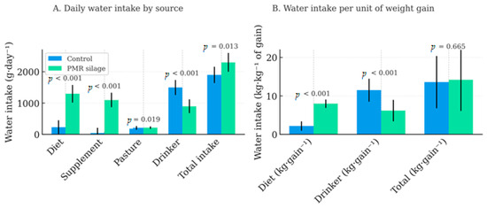 Animals fed PMR silage had more than 430% higher dietary water intake compared to the control group (p < 0.001) (Figure 2). The supplement fraction was nearly 60 times greater in the PMR group (p < 0.001). Total dietary water intake was 22% higher in PMR-fed animals (p < 0.001). Water consumption from drinkers was 38% lower in PMR-fed animals (p < 0.001). When expressed per kilogram of body weight gain, total water intake did not differ significantly between treatments (p = 0.67).