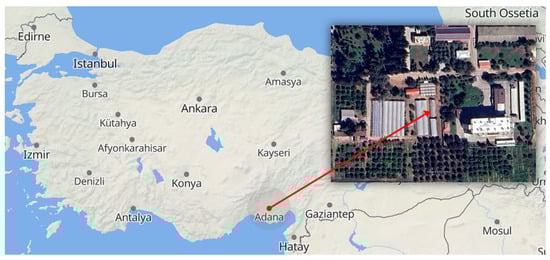 An experimental study was conducted on two similar greenhouse sections, one with and one without PCM (CO), each with an area of 60 m2, covered by a single layer of polyethylene in Adana (37°00′38″ N, 35°20′21″ E) in the south of Türkiye to explore the thermal behavior of root zone in greenhouse (Figure 1) in February, March and April 2022. Dimensions of the plastic greenhouse are 10 m (length), 6 m (width), and 3.75 m (height). The greenhouse frame is made of aluminum and steel materials, positioned in the north–south direction. A single layer of polyethylene (PE) cover with a thickness of 0.35 mm is used as the cover material in the greenhouse. The experimental study started on 4 February 2022 with cleaning of the greenhouse, preparation of stands where PCMs will be placed, setup of the plant-growing environment, and ended on 26 May 2022. As a plant-growing medium, a mixture of 50% cocopeat and 50% pumice materials was used instead of soil. These materials were filled into pots with a width of 44 cm, a height of 35 cm, and a volume of 27 L. For irrigation and fertilization, micro drippers were added to the irrigation line and positioned inside the pots. A total of 190 pots were placed in both greenhouses (95 pots each).