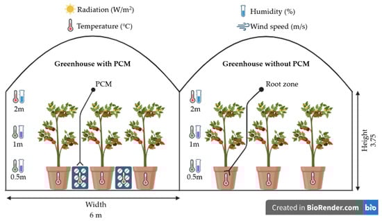 The environment inside the greenhouse is regulated using active or passive systems. While active heating systems often rely on nonrenewable fossil fuels, passive systems offer a more sustainable approach by utilizing naturally stored thermal energy. The semi-closed architecture of greenhouses makes them particularly suited for passive heating, capturing and storing solar radiation during the day for nighttime use, which is a principle aligned with the net-zero energy greenhouse concept. Consequently, enhancing energy efficiency through effective thermal storage techniques is vital not only for reducing operational costs but also for minimizing greenhouse gas emissions and promoting sustainable greenhouse agriculture [5,6,7,8].