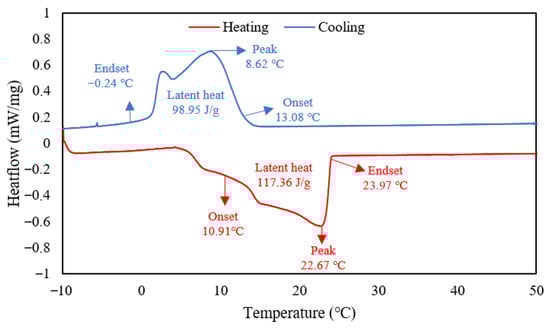 Differential Scanning Calorimetry (DSC) is the most used method to determine the melting/freezing points, phase-change heat and specific heat capacity of PCMs. In this study, DSC measurements were carried out with a Mettler Toledo brand device located at Cukurova University Central Research Laboratory, using a 10 mg CO sample in a nitrogen atmosphere with a nitrogen flow rate of 40 mL/min and a heating–cooling rate of 1 °C/min. Each sample was heated from −10 °C to 60 °C and similarly cooled from 60 °C to −10 °C. Also, thermal conductivity of CO was measured using HotDisk2500S with capton sensor at 25 °C ambient temperature. Differential scanning calorimetry and thermal conductivity analysis of coconut oil used in the study is given in Figure 5 and Table 4. Investigation of the usability of coconut oil as a PCM, the specific enthalpy and thermal conductivity values were like other studies in the literature as expected [36,37,38,39]. CO gives back 98.95 J/g of the 117.36 J/g of energy it takes in during heating, and its storage efficiency is 84.3%. Although the thermal conductivity coefficient of the sample is low at 0.193 W/m.K, it is a product with development potential due to the abundance of CO, its natural origin, and the ability to increase the thermal conductivity coefficient with nanoparticles.