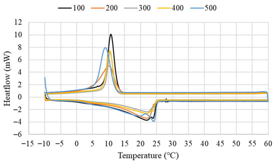 The biochemical stability of coconut oil, classified under the fatty acid group in PCM classification, is reported to withstand 200 thermal cycles [40] or more than two years, making it also cost-effective. Overall, studies suggest that coconut oil is suitable for thermal applications for building as a heat-storage material [15,37,41,42,43]. Thermal stability analysis of CO was performed with different numbers of cycles (100, 200, 300, 400, and 500), and results are given in Figure 6.