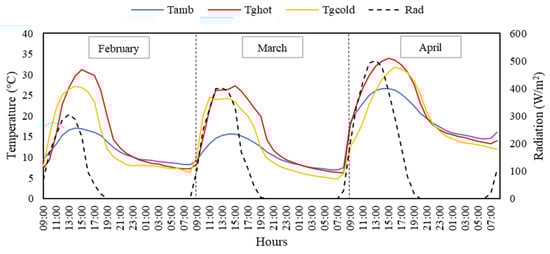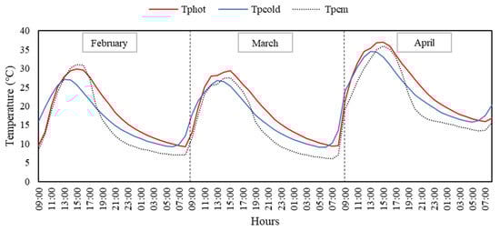 The thermal performance of PCM on root-zone temperatures for tomato plants in greenhouses were examined and compared. According to the results obtained from the experimental study, it was observed that the greenhouse indoor air, PCM temperature, and root-zone temperatures started to decrease as of 15:00 local time, when the energy gain resulting from solar radiation was lower than the heat loss in the greenhouse indoor. The average of global solar radiation of the investigated months are 173.9, 252.2, and 338.5 W/m2, February, March, and April, respectively. Of hourly average ambient temperatures (Tamb) examined, the coldest month for both daytime (09:00–18:00) and nighttime (18:00–09:00) is March. The average ambient daytime–nighttime temperatures for February are 14.8 °C, and 9.9 °C, respectively. These temperatures are 13.9 °C and 8.6 °C for March and 24.2 °C, and 16.9 °C for April. Indoor air temperatures of the PCM-equipped greenhouse were 1.2 °C, 1.3 °C, and 4.5 °C higher than the control greenhouse indoor temperature during daytime for February, March, and April, respectively. These temperatures were 1.8 °C, 2.4 °C, and 0.4 °C higher than the control greenhouse in the PCM-equipped greenhouse indoor air (Figure 8). The average difference between root-zone temperatures in the greenhouse (with PCM) compared to root-zone temperatures in the control greenhouse (without PCM) are 1.76 °C, 0.91 °C, and 1.46 °C higher for February, March, and April, respectively (Figure 9). The findings obtained from the experimental study are similar [6,8].