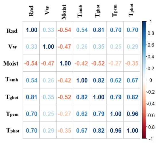 Linear relationship between measured parameters were determined using Pearson correlation coefficient (R), and the results are illustrated (Figure 10). As can be seen from Figure 10, Tphot has a positive and highly significant correlation (p < 0.001) with Tpcm (0.96), Tghot (0.82), Rad (0.70) and Tamb (0.67). Rad positively correlated with Tghot, Tpcm, and Tphot, with R ranging from 0.70 to 0.81, and Moist is negatively correlated with Tamb, Tghot, Tpcm, and Tphot (p < 0.001).