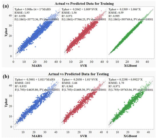 Relationship between actual and predicted data both training (a) and testing (b) datasets.