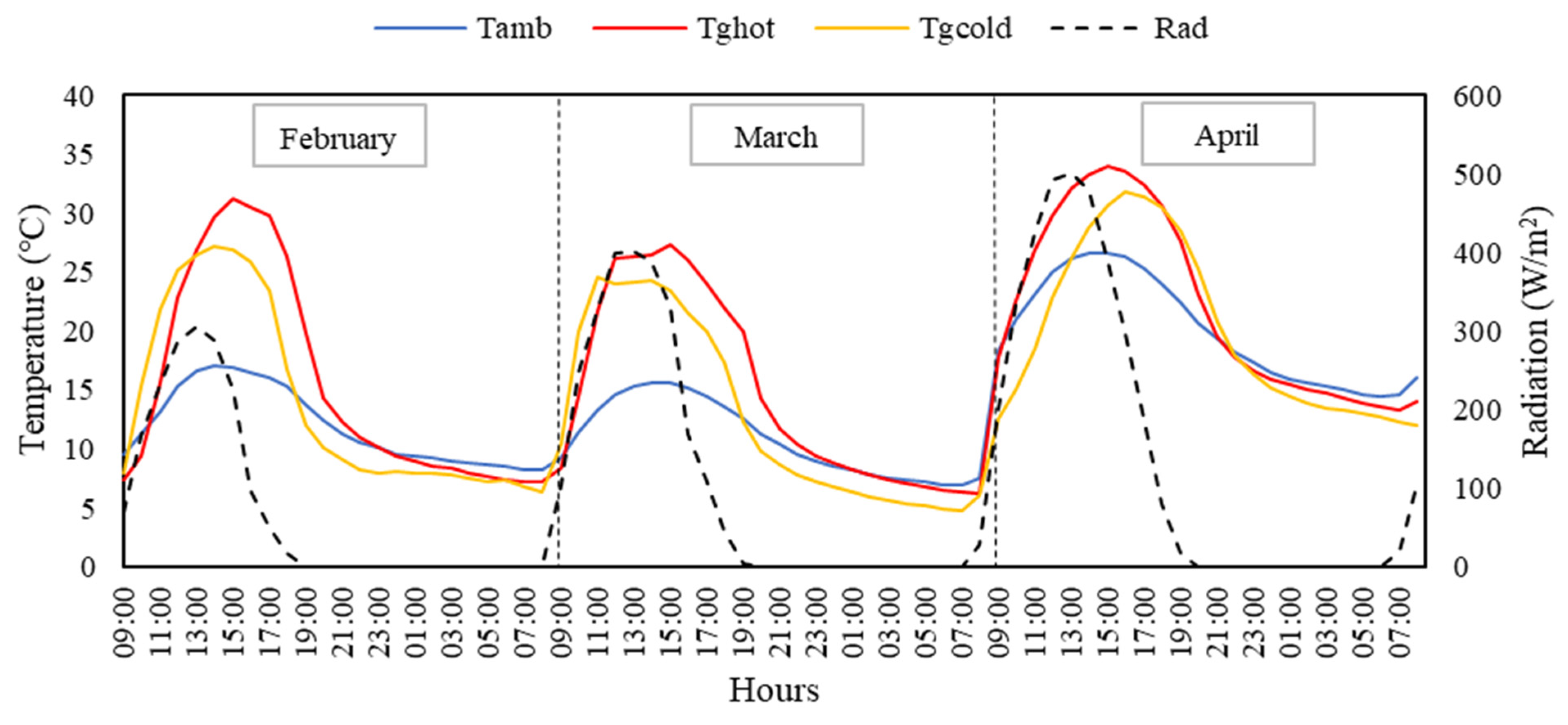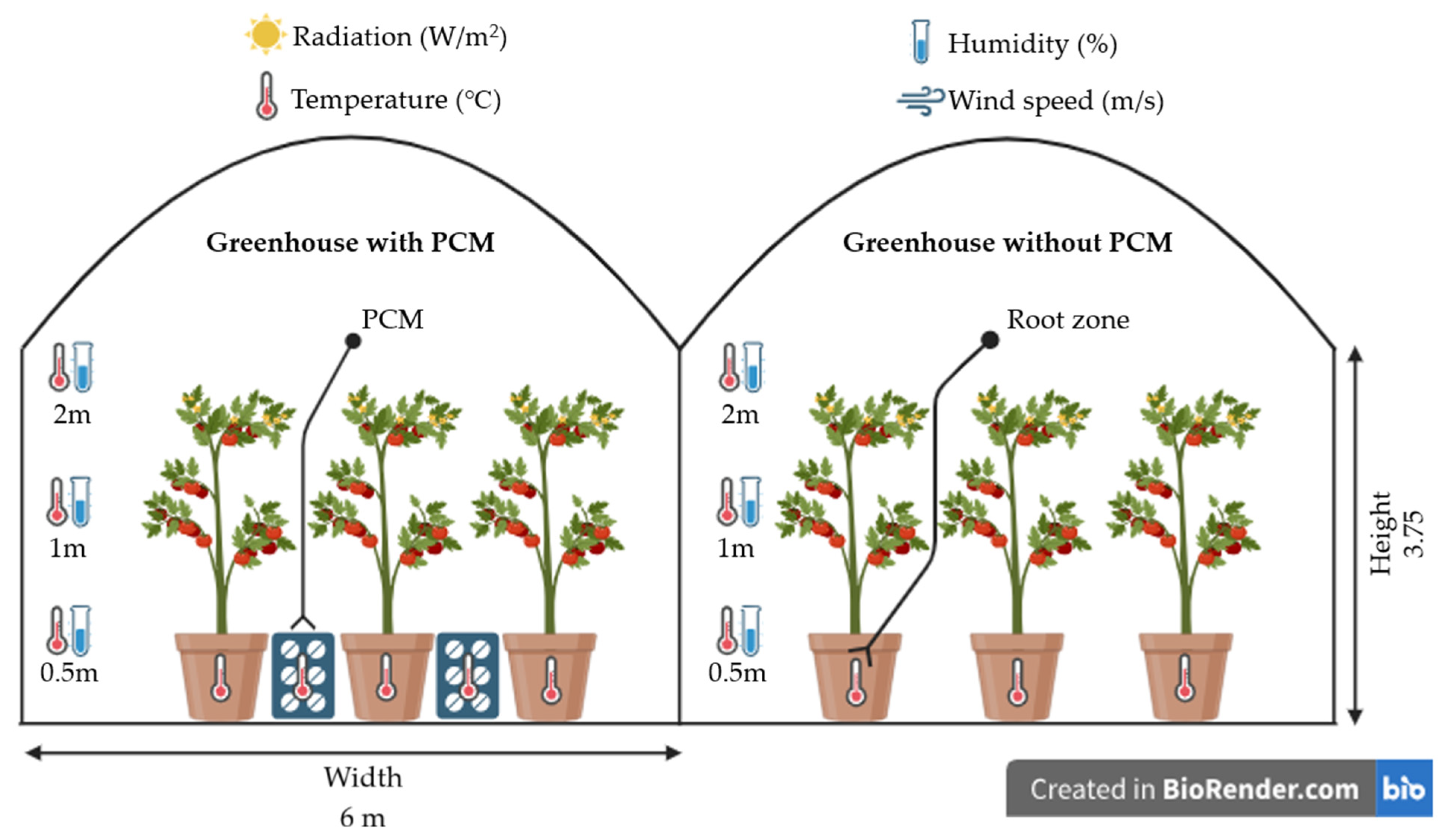 50] reported that the air temperature inside the greenhouse should be 12 °C higher than the air temperature outside. With the proposed heat-storage application, both greenhouse indoor temperatures and root-zone temperatures were found to be higher than control groups. Root-zone temperatures in the greenhouse compartment where the heat-storage application was made showed better results during the night hours compared to the control group. The reason why the plant root-zone temperatures in the greenhouse with heat storage are lower before noon is that the PCM has collected and stored heat from the interior, and both the interior and root-zone temperatures have decreased. Indoor temperatures were found to be 1.8 °C, 2.4 °C, and 0.4 °C higher than the control greenhouse in February, March, and April, respectively, with a short-term (day to night) heat-storage process. Root-zone temperatures were observed to be 1.76 °C, 0.91 °C, and 1.46 °C higher than control pots for the same months, respectively.