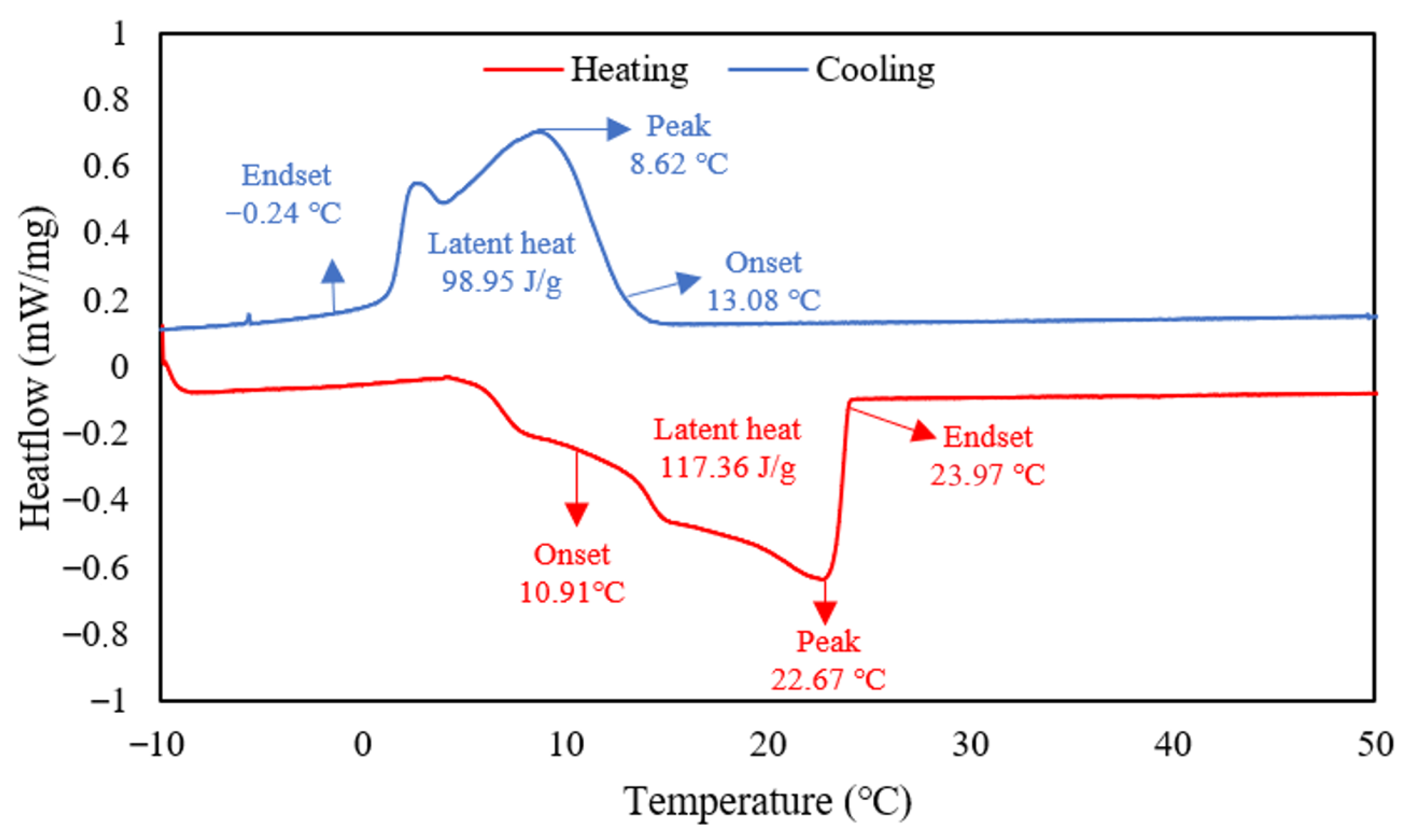 Differential Scanning Calorimetry (DSC) is the most used method to determine the melting/freezing points, phase-change heat and specific heat capacity of PCMs. In this study, DSC measurements were carried out with a Mettler Toledo brand device located at Cukurova University Central Research Laboratory, using a 10 mg CO sample in a nitrogen atmosphere with a nitrogen flow rate of 40 mL/min and a heating–cooling rate of 1 °C/min. Each sample was heated from −10 °C to 60 °C and similarly cooled from 60 °C to −10 °C. Also, thermal conductivity of CO was measured using HotDisk2500S with capton sensor at 25 °C ambient temperature. Differential scanning calorimetry and thermal conductivity analysis of coconut oil used in the study is given in