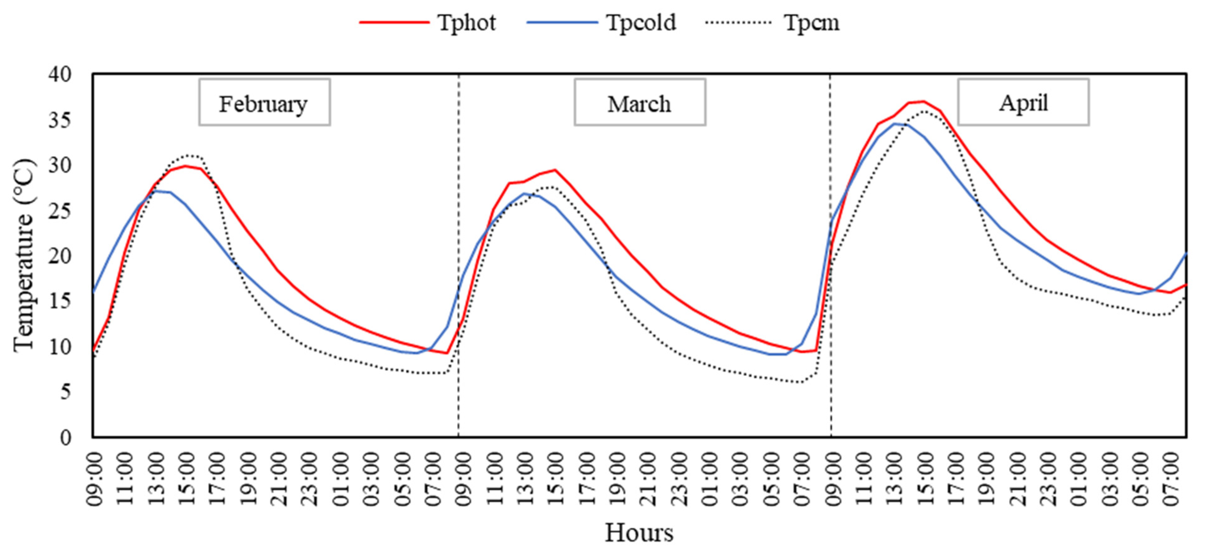 Table 5. The average root-zone temperature (Tphot) ranges between 3.30 °C and 44.65 °C. The average of Tpcm, which is thought to be the most effective parameter on Tphot, varies between −1.84 °C and 44.65 °C.