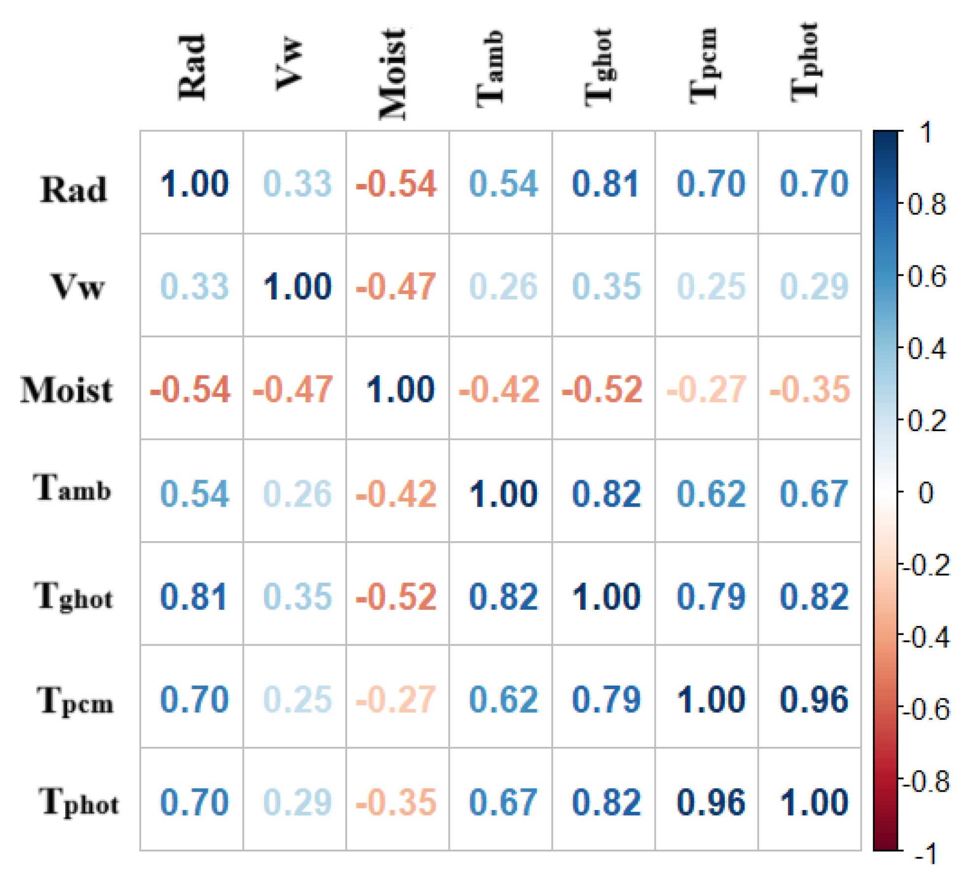 p < 0.001) with Tpcm (0.96), Tghot (0.82), Rad (0.70) and Tamb (0.67). Rad positively correlated with Tghot, Tpcm, and Tphot, with R ranging from 0.70 to 0.81, and Moist is negatively correlated with Tamb, Tghot, Tpcm, and Tphot (