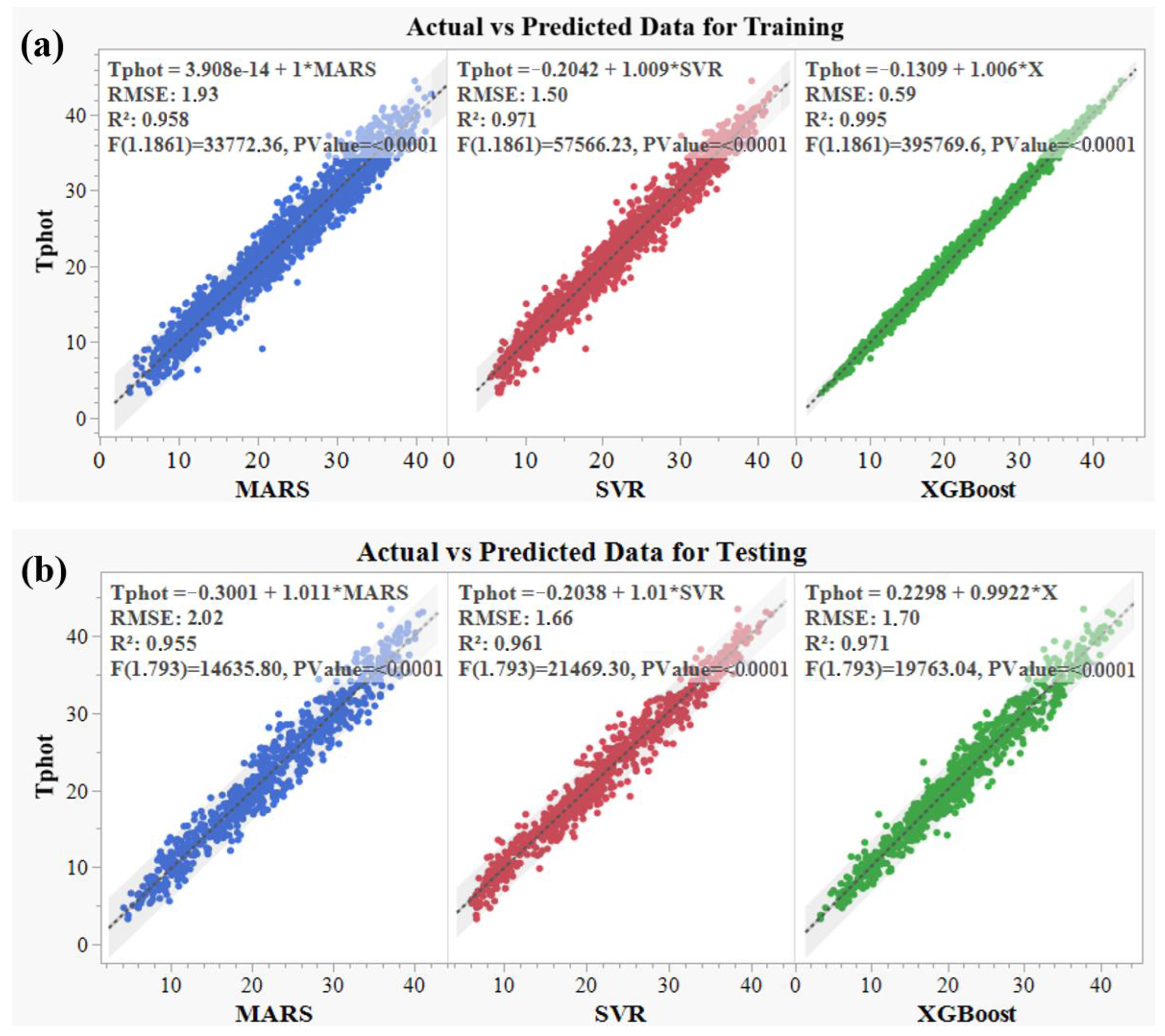Table 6. The smallest RMSE for training is 0.59 °C in XGBoost and for testing is 1.66 °C for SVR. Ref. [