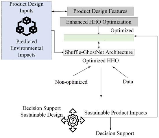 Conceptual representation of the Shuffle-GhostNet framework merged with enhanced HHO optimization and LCA for sustainable product design. The proposed framework’s end-to-end workflow is represented by the following flowchart: (1) preprocessed and normalized product design parameters (material, manufacturing, and end-of-life strategies); (2) environmental impact prediction (e.g., CO2eq, energy use) by the Shuffle-GhostNet architecture with high accuracy and low computational cost; (3) hyperparameter tuning, which automatically maximizes predictive performance in EHHO; (4) feedback as actionable recommendations for sustainable design options. This integration allows for real-time, continuous sustainability assessments for feedback between engineering design and environmental impact evaluation.