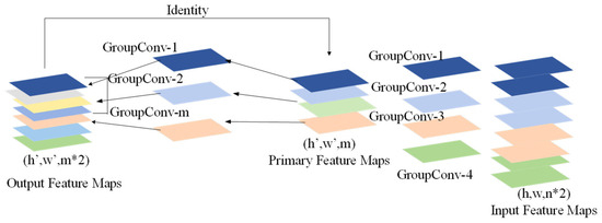 The original module of GhostNet employs a 1 × 1 convolution as its main convolution method to modify the dimension of the channel, efficiently minimizing the model parameters in comparison with 5 × 5 or 3 × 3 convolutions. Nevertheless, the association between the inexpensive convolution and the primary convolution design required improvement. To create more effective feature extraction modules, the Shuffle-Ghost module has been introduced, illustrated in Figure 4.