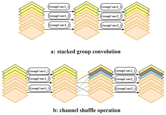 Figure 5a illustrates the scenario when group convolution has been layered. In this case, the group convolution has three groups; for example, GroupConvN_M, where N represents the quantity of group convolutions, and M represents which specific group within the convolution of the group. To exemplify, GroupConv1_1 refers to the operation of convolution performed by the initial group within the initial convolution of the group. The outcomes of the output of the initial group have been solely connected to the input of the initial group, and this pattern continues, which restricts the exchange of information between distinct groups.