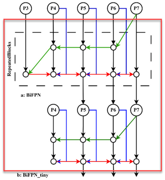 Figure 6 illustrates both the suggested BiFPN-tiny and BiFPN. Although the original BiFPN utilizes five layers for the extraction of features to ensure efficient feature processing, this setup can be somewhat superfluous and fails to account for the specific characteristics.