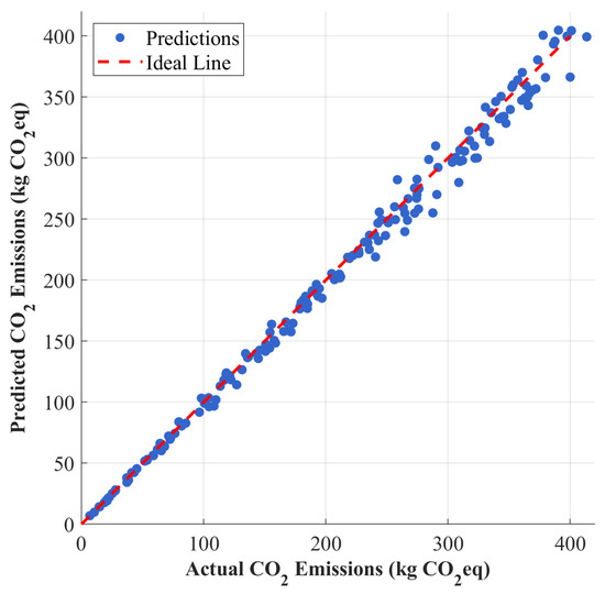 To evaluate the practical applicability of the proposed model, a case study was carried out on three alternatives of a consumer electronic product (smart speaker). Based on predictions by Shuffle-GhostNet, CO2 emissions and primary energy demand for the cradle-to-gate stages were estimated for each design alternative. The scatter plot in Figure 12 gives predicted and actual CO2 emissions for a total of 186 test products, including this case study. The points lie close to the y = x line, indicating good prediction accuracy.