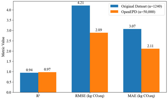 We modeled Shuffle-GhostNet + EHHO on the original Ecoinvent data (1240 samples) and the OpenEPD data (50,000 samples). Important measures (R2, RMSE, MAE) were calculated on a test set that was held out (15 percent of each dataset). Findings indicate that there are considerable increases in R2, RMSE, and MAE: the R2 decreased by 0.223, the RMSE decreased to 2.89 kg CO2eq, and the MAE decreased to 2.11 kg CO2eq. This goes to show the scalability of the model and that it can make use of larger and more varied data to generalize more effectively. Figure 15 shows a performance comparison.