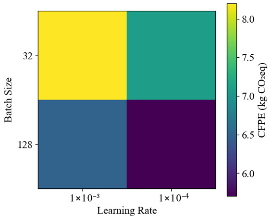 Tuning Shuffle-GhostNet to achieve the best performance on the OpenEPD data, we searched over two critically important hyperparameters: batch size (32 vs. 128) and learning rate (1 × 10−3 vs. 1 × 10−4). Hyperparameter sensitivity is especially a problem with large datasets such as OpenEPD, where convergence and generalization of the models are a factor of balancing stability of the gradients (through batch size) and learning rate (through step size). The idea was to find the configuration minimizing a Carbon Footprint Prediction Error (CFPE) on a validation set of 7500 samples (15 percent of OpenEPD). The 100-epoch training was performed with early stopping, and the outcome was visualized as a heatmap to indicate the interactions between the parameters. Figure 18 shows the CFPE sensitivity to hyperparameters (OpenEPD).