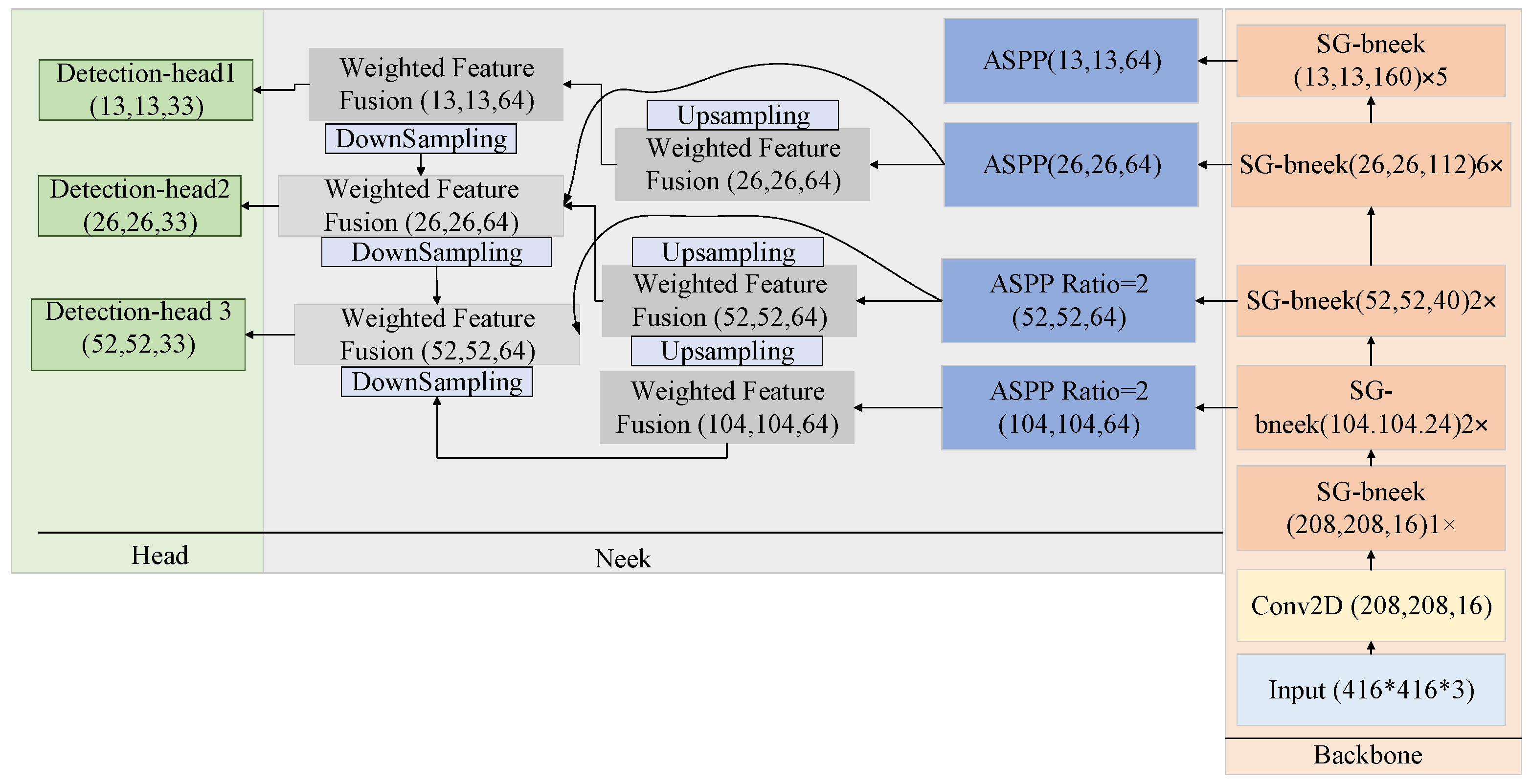 The design of the bottleneck of Shuffle-Ghost looks like a residual model, comprising two modules of a stacked suggested model. Furthermore, the channel shuffle operation has been implemented to enhance the stream of data across distinct groups of attributes. In the neck segment of the network, a feature pyramid with four layers has been established through integrating the modules of ASPP and BiFPN-tiny, utilizing three layers to extract features and reserving a layer to improve attributes pertaining to tiny objects.