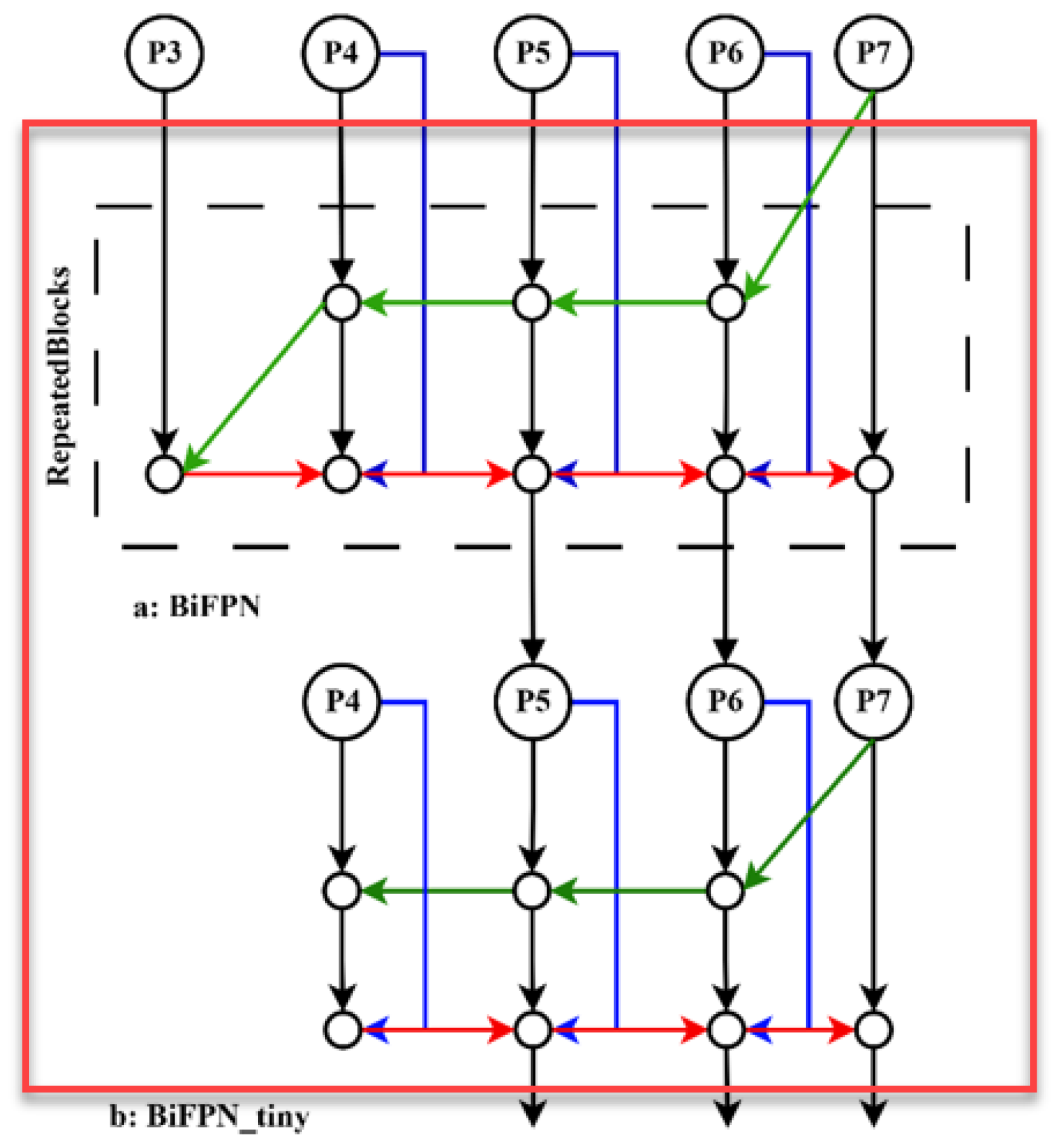 Figure 6. The architecture of the suggested BiFPN-tiny and BiFPN.