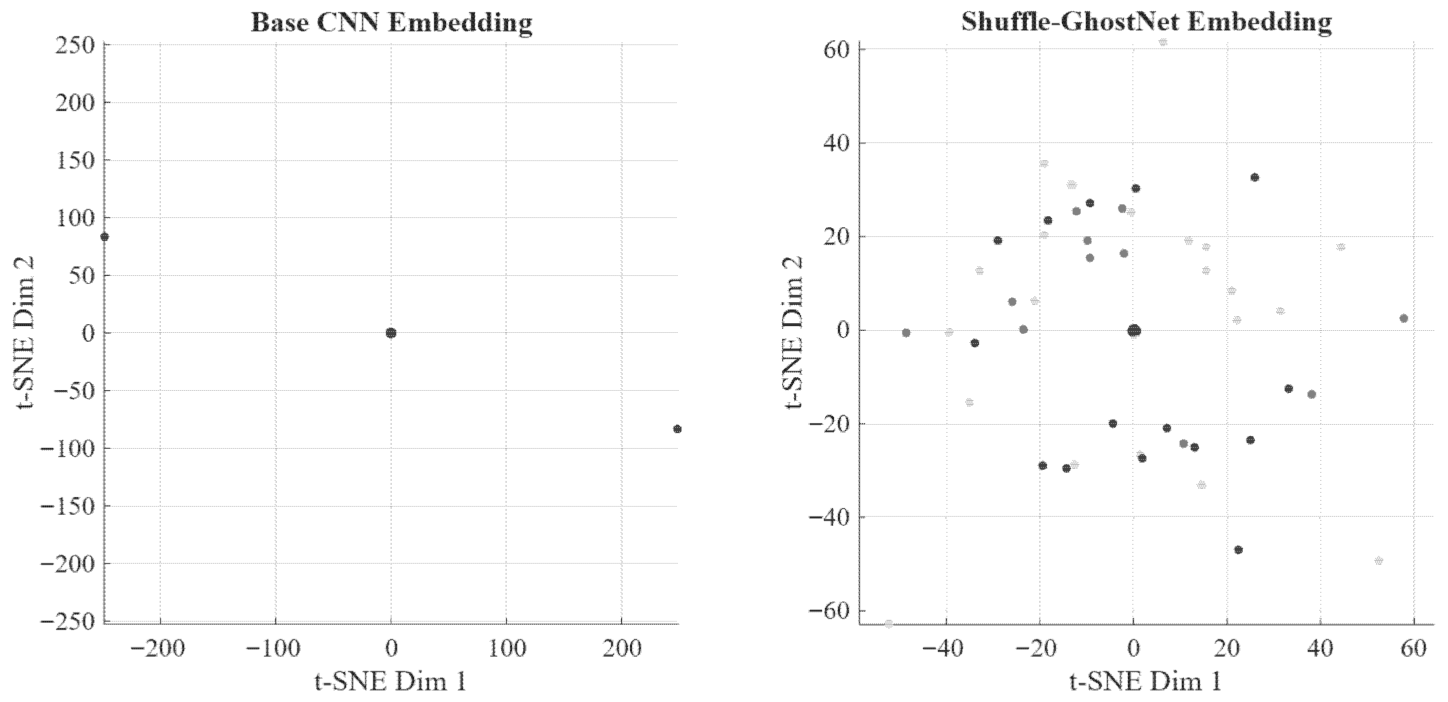 Figure 13. Manual t-SNE: base CNN vs. Shuffle-GhostNet.