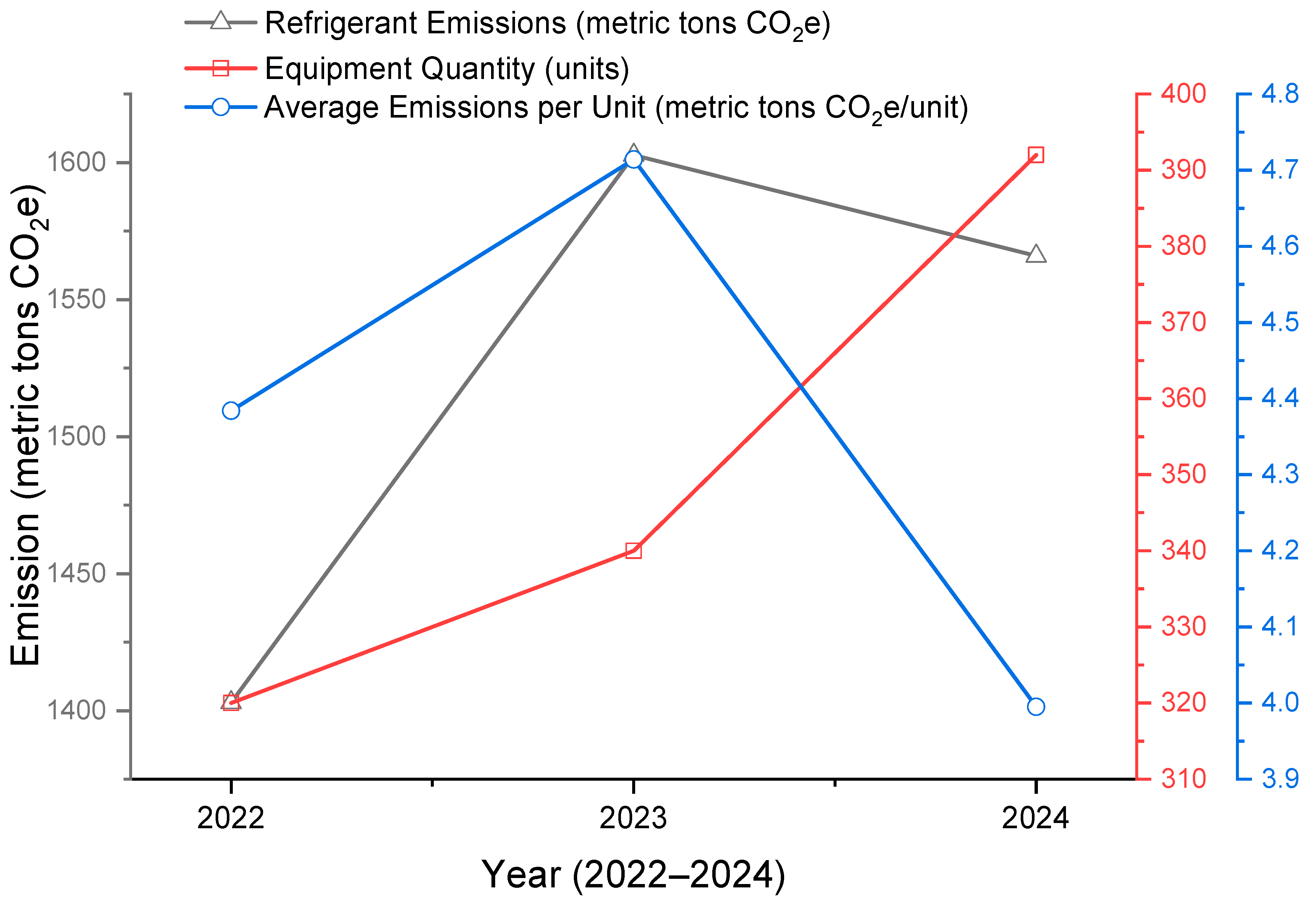 Figure 4 trends in total refrigerant fugitive emissions, number of equipment units, and average emissions per unit (2022–2024). The Figure illustrates that, following initial increases in both emissions and equipment numbers, the implementation of effective management strategies led to a notable reduction in average per-unit emissions in 2024, despite the continued expansion of the inventory.
