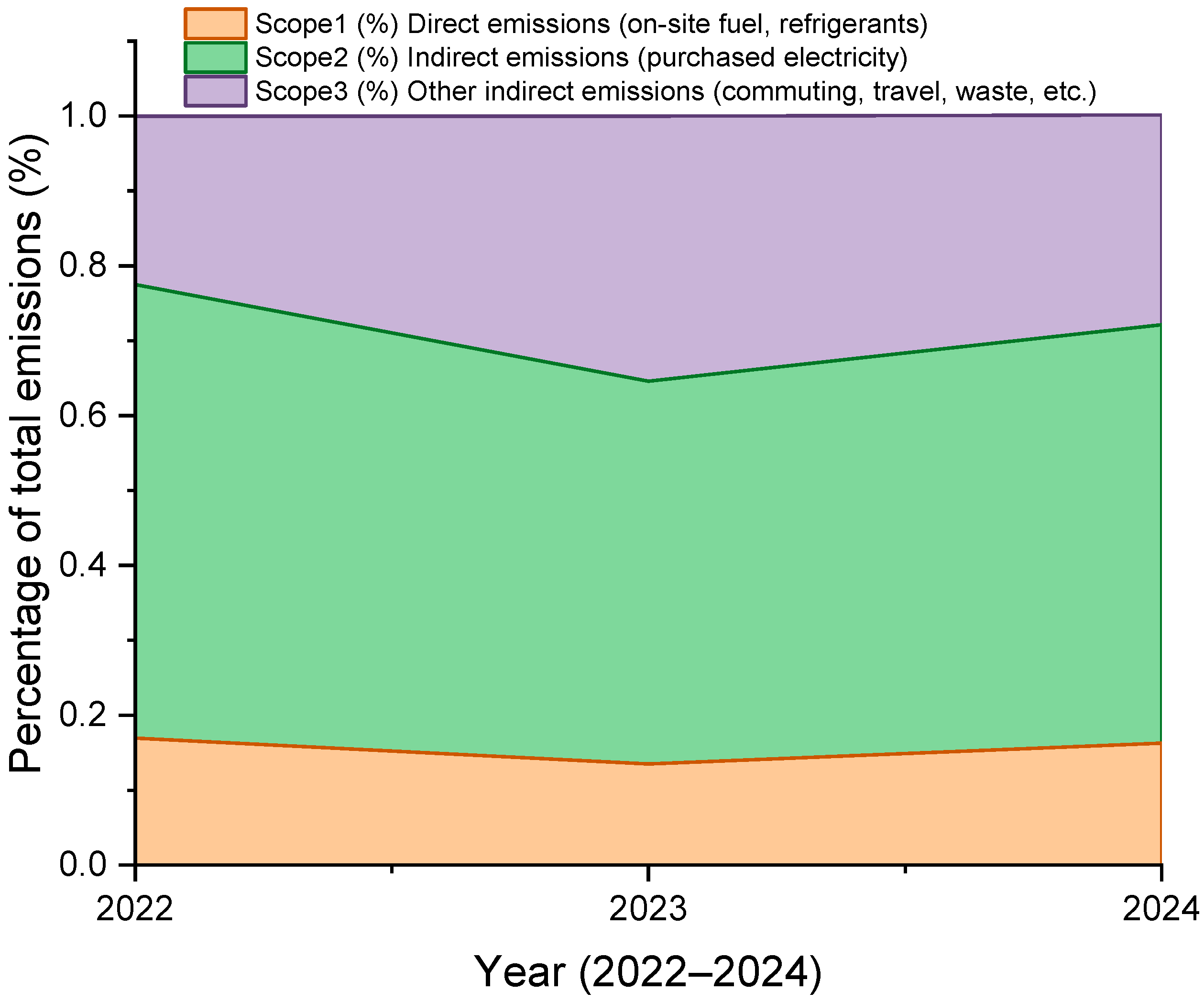 Figure 2 illustrates annual emission compositions by category from 2021 to 2024, underscoring the increasing importance of indirect and behavior-driven sources.