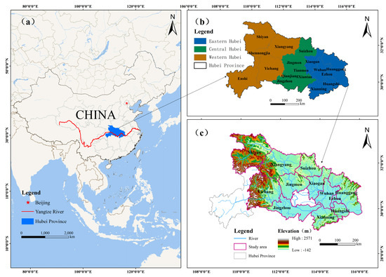Study area and regional classification. (a) Location of Hubei Province in China; (b) Regional division of Hubei Province into eastern, central, and western Hubei; (c) The study area in Hubei Province. Note: The maps are produced based on the standard map GS (2024)0650 from the National Platform for Common Geospatial Information Services, with no modification to the base map.