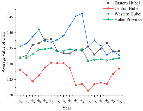 Average value of CEE in Hubei and three regions from 2006 to 2022.