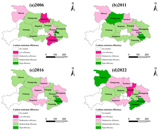 This study selects 2006, 2011, 2016, and 2022 as the observation years. According to Figure 3, the CEE of each city exhibits a spatial pattern of being high in the west, low in the center, and moderate in the east. The eastern region exhibited considerable internal variation: Wuhan, Huangshi, and Xianning experienced consistent improvements in CEE, whereas Xiaogan, Huanggang, and Ezhou maintained medium-to-low performance levels. While the central portion of Hubei Province remained within the medium-to-low CEE range, the western portion consistently maintained a medium-to-high CEE level, leading the province.