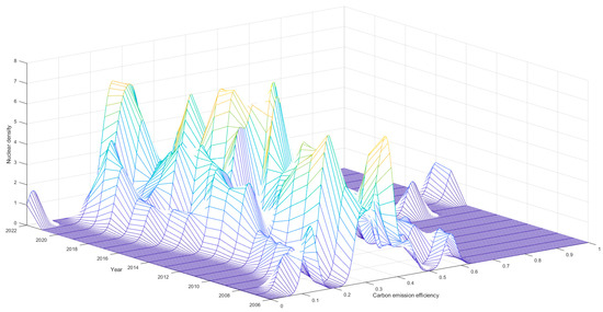 The CEE of the cities exhibited an upward trend throughout the study period. The kernel density curves further indicated that the polarization of CEE among cities in the province had intensified. Therefore, deploying more location-specific emission reduction strategies is essential for advancing the low-carbon transition.