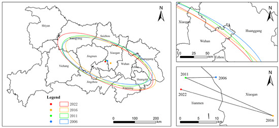 This study uses ArcGIS 10.8 to examine the spatial distribution characteristics of CEE in different cities. The spatial pattern evolution and migration characteristics of CEE in Hubei Province are analyzed through the migration path of the gravity center and the evolutionary trends of key parameters, as presented in Table 3 and Figure 5. The latitude and longitude coordinates of the gravity center reveal the dynamic shifts in the spatial center of CEE in Hubei Province. In 2006, the gravity center was located in the central-eastern region of the province. By 2011, it had shifted slightly westward, indicating enhanced CEE in the western region. In 2016, it moved northeastward, reflecting the consolidation of favorable regions around the Wuhan and Xiaogan urban agglomerations in northeastern Hubei. By 2022, the gravity center shifted slightly southwestward, although it remained within the central-eastern part of the province.
