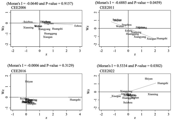 Moran scatter plot of CEE in prefecture-level cities of Hubei from 2006 to 2022.