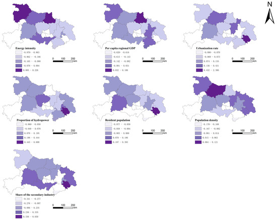 The GTWR model results indicate that the determinants of CEE across the three major regions of Hubei Province exhibit distinct characteristics, as shown in Figure 7. Among them, the most complex mechanism is observed in eastern Hubei. In eastern Hubei, energy intensity generally negatively influences CEE, particularly in Huangshi, where traditional industries dominate. The proportion of hydropower exerts a significant positive influence on CEE in most cities. CEE is typically negatively associated with per capita GDP. The impact of the secondary sector share on CEE varies considerably across eastern Hubei: while most cities exhibit a positive correlation, Wuhan and Xianning display negative correlations. Owing to dense populations, Wuhan, Ezhou, and Xianning exhibit lower CEE. Furthermore, urbanization rates positively influence CEE in eastern Hubei, except Wuhan.