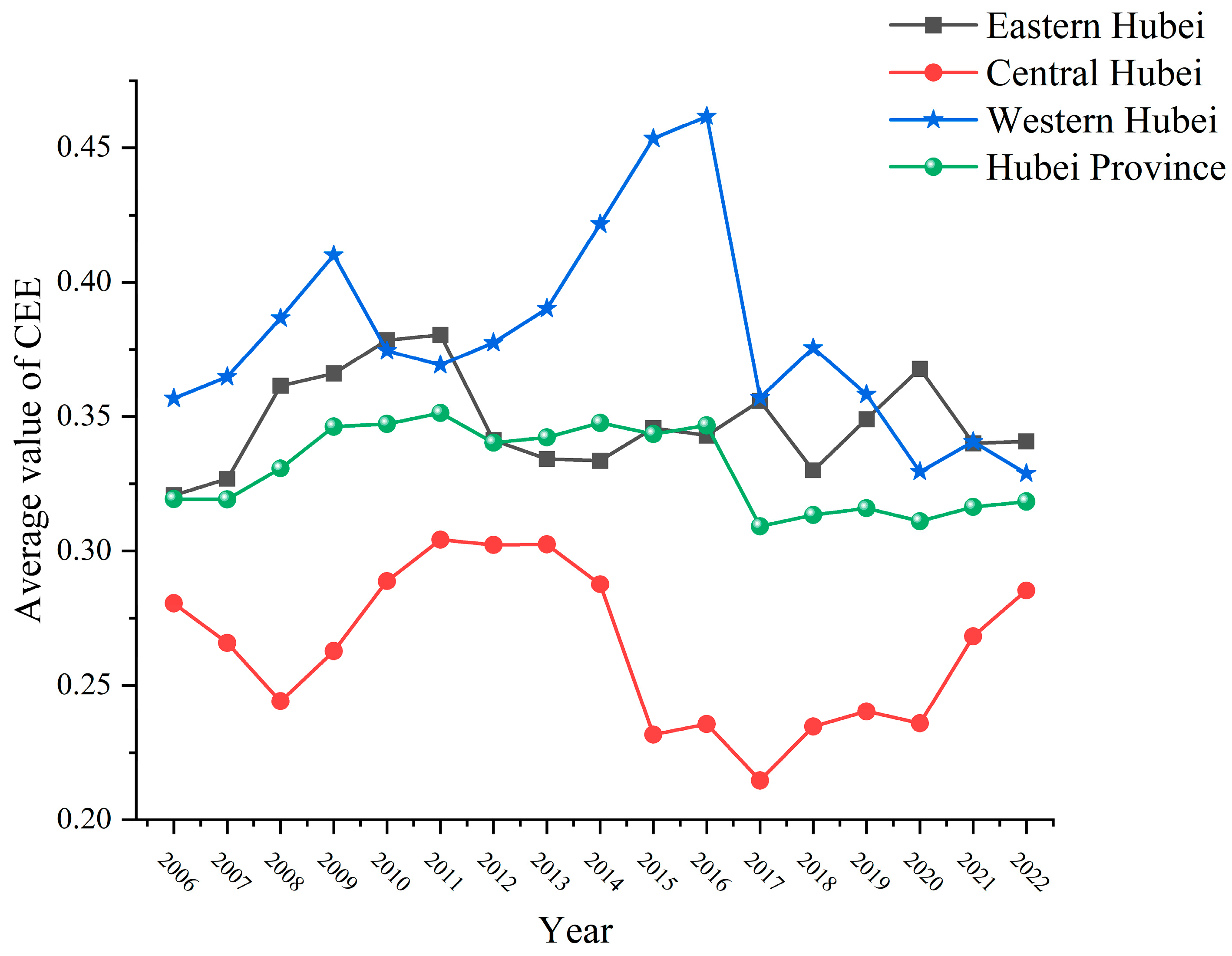 4.2. Evolution Trend of Hubei’s City-Level CEE