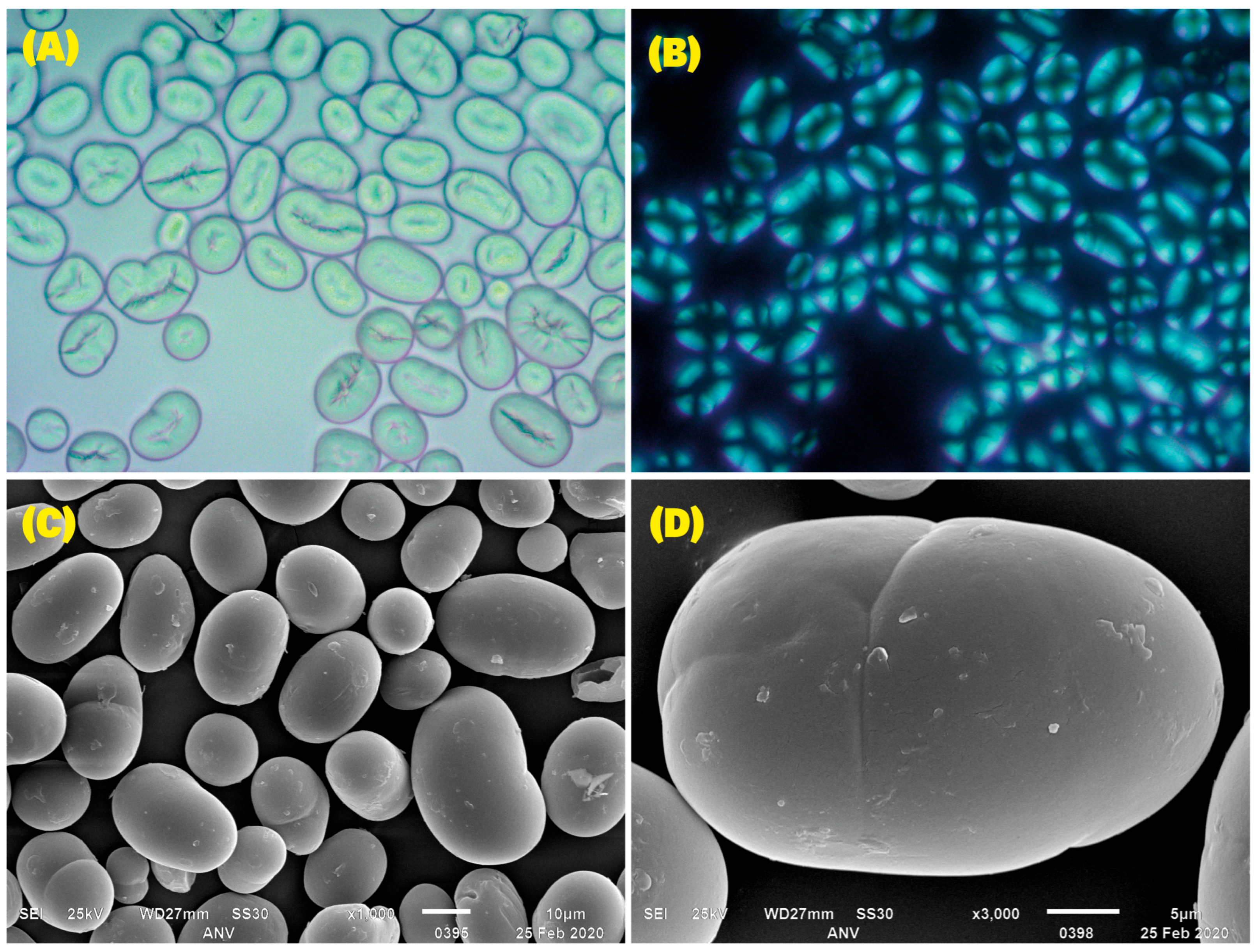 3.2. Morphological Characteristics of Starch Granules According to OM and SEM