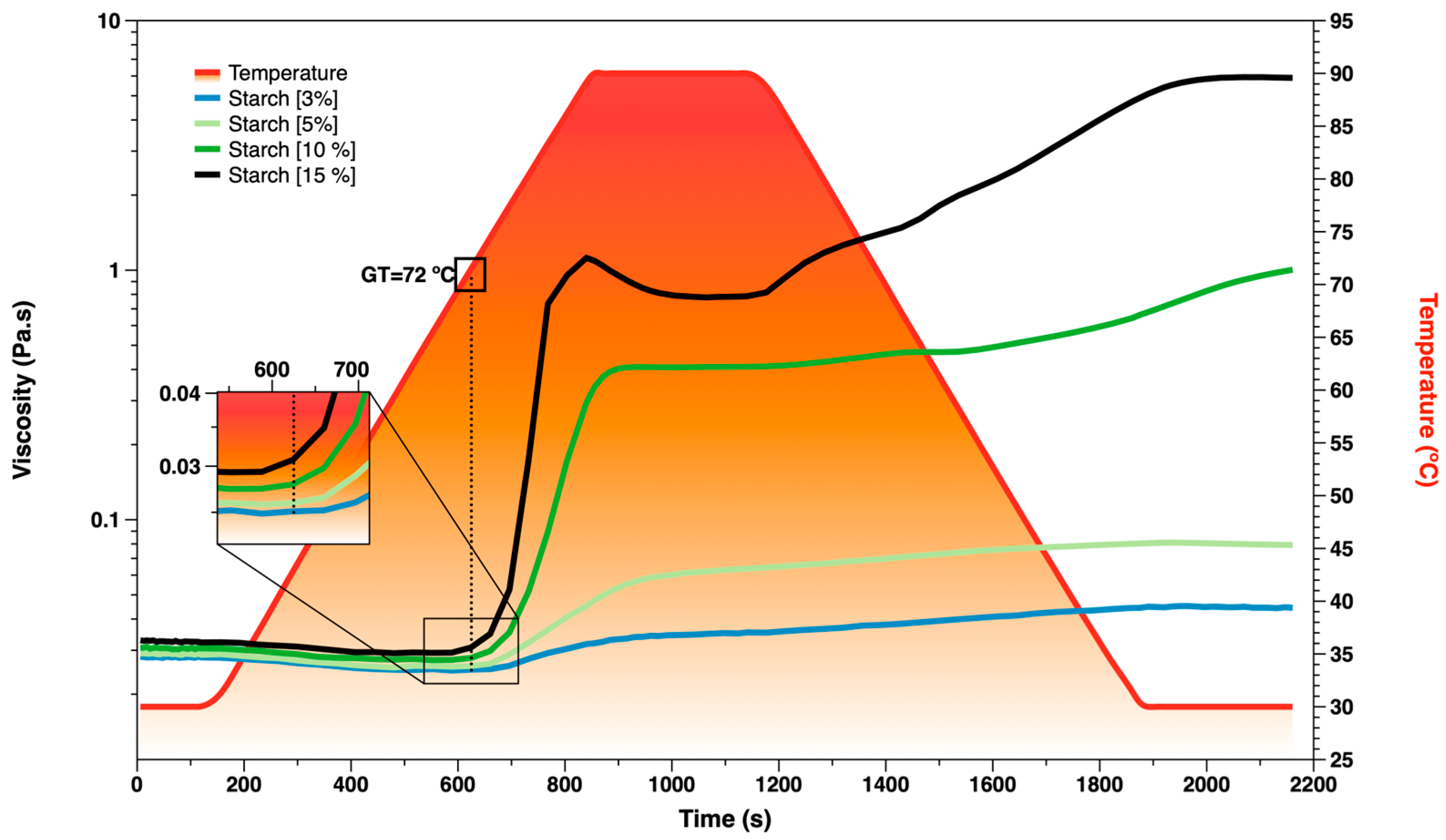 | [Starch] % | GT (°C) | Pv (Pa·s) | SBv (Pa·s) |