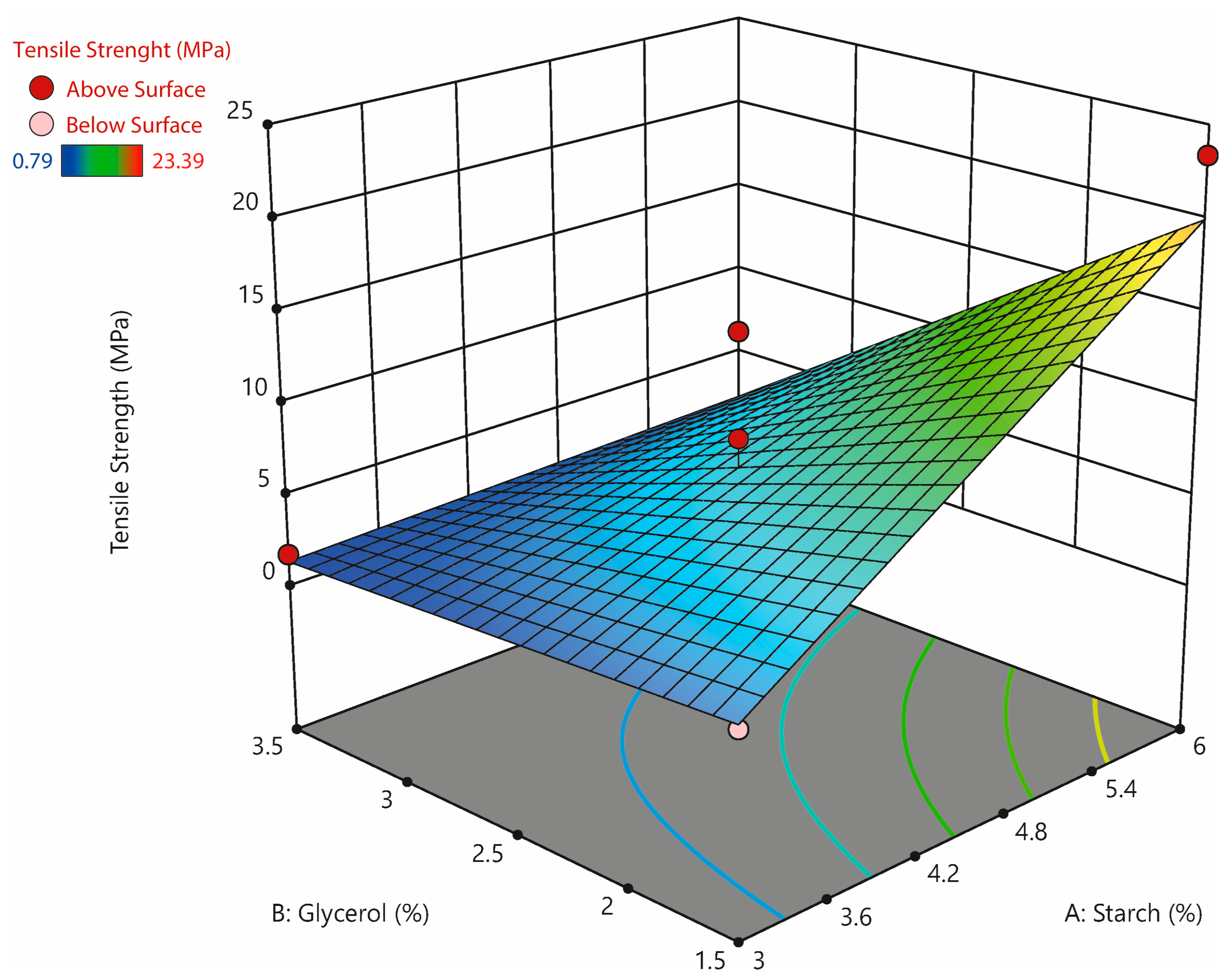 | Std Order | Run | Factor 1: Starch (%) | Factor 2: Glycerol (%) | Tensile Strength (Mpa) |