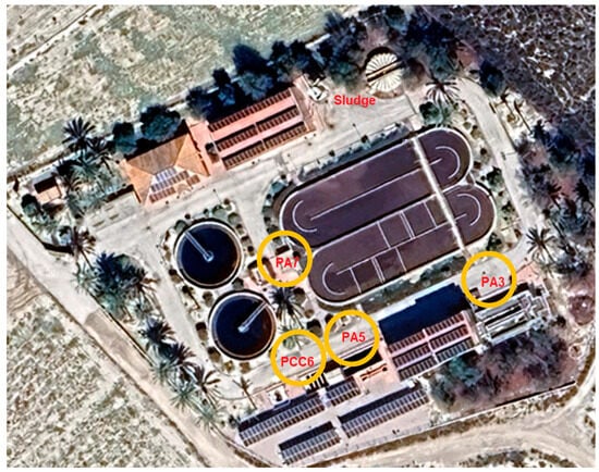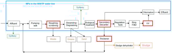 The first step was to identify the points in the WWTP where it is most interesting to verify and quantify the presence of MPs in the water flow, which are then marked on a process flow diagram and on a satellite image of the WWTP (Figure 1 and Figure 2). The most representative points of the water line selected for the study were: