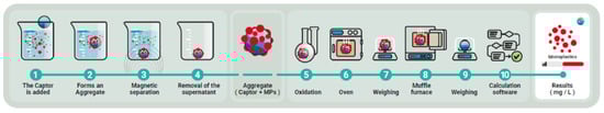 This is a semi-automated system for quantifying MP in complex aquatic matrices, such as urban and industrial wastewater. The determination method combines several techniques, including filtration, magnetic extraction and selective oxidation, to effectively isolate and measure MP. For more details, see Figure 5.