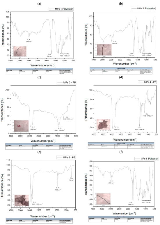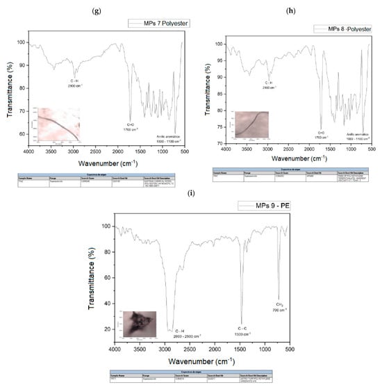The spectra of the analyzed polymers, identified using micro-FTIR, are shown in Figure 7a–i. The signals obtained in the spectra were analyzed and the spectra were compared with the database available in the equipment.