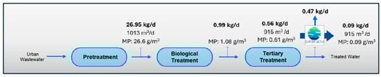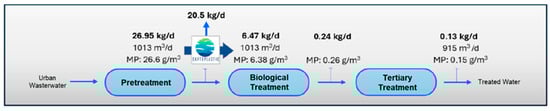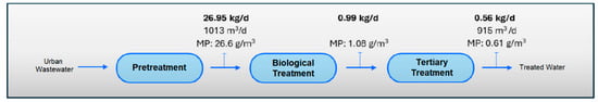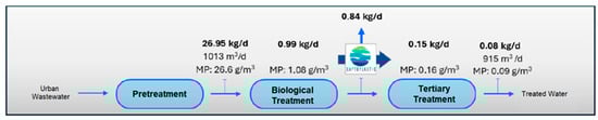 Although WWTPs were not specifically designed to remove solid particles (PM), the physical, chemical and biological processes involved in their various stages contribute significantly to their retention. Various studies have shown that conventional plants can remove up to 70%, and in plants with membrane technology, up to 98%, of the PM present in the wastewater, depending on the design, the degree of treatment applied and the characteristics of the particles [45,46,47].